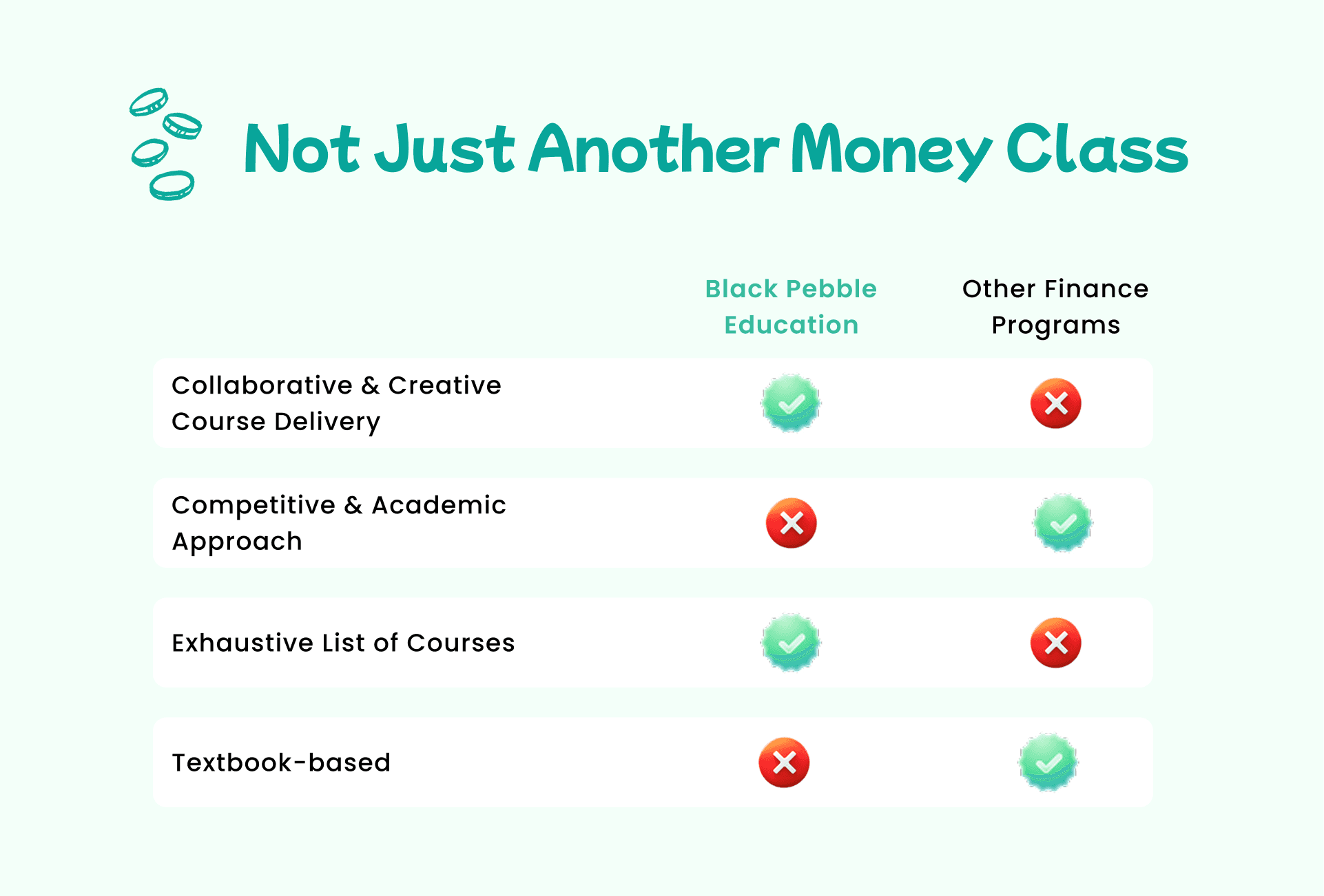Created a simple side-by-side card comparison to show how Black Pebbles covers real-world money skills—not just textbook terms—helping parents immediately see the value.
