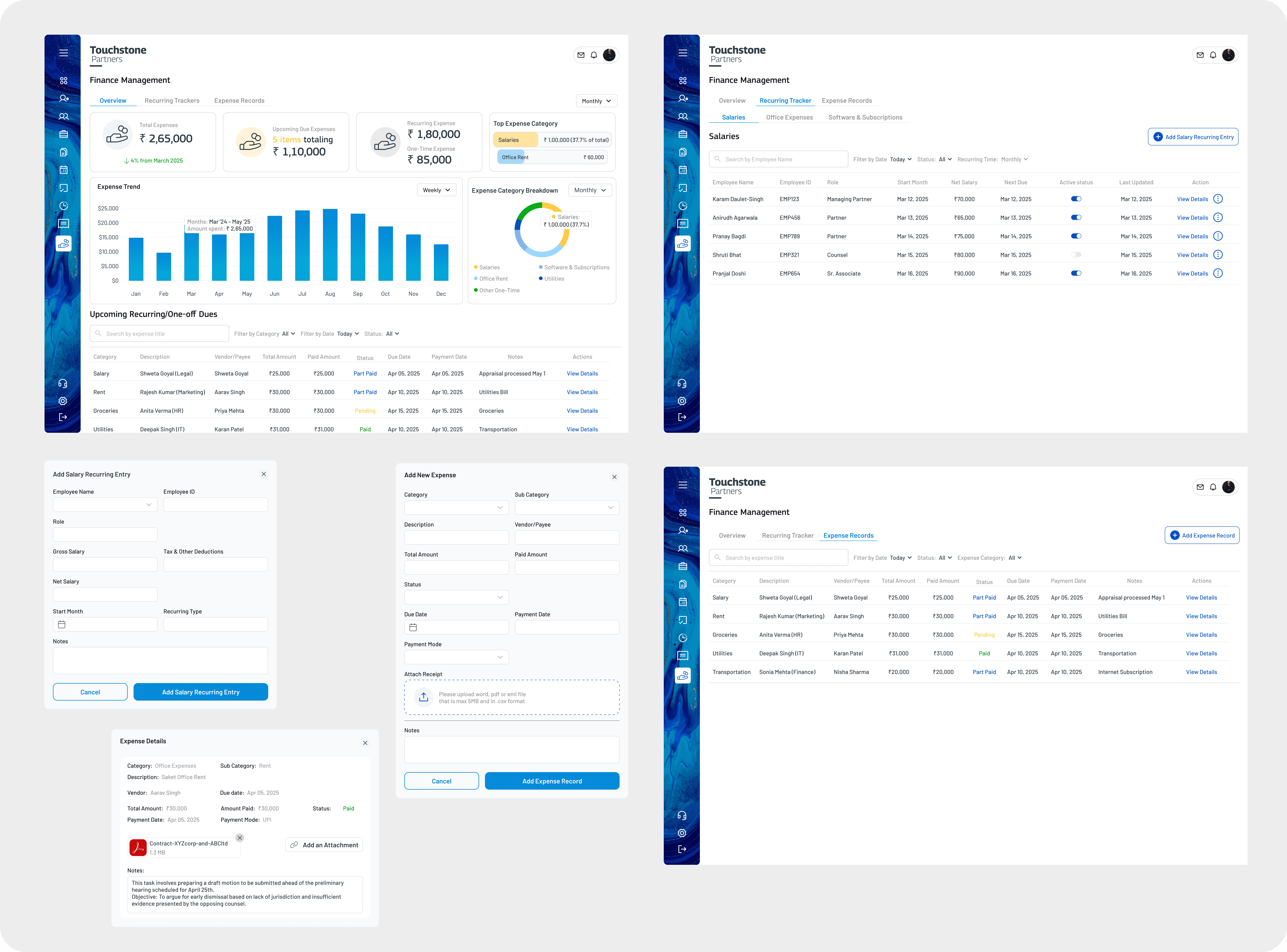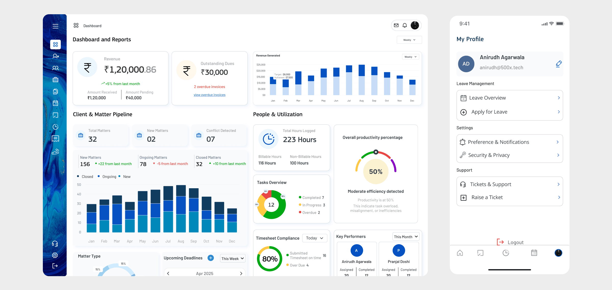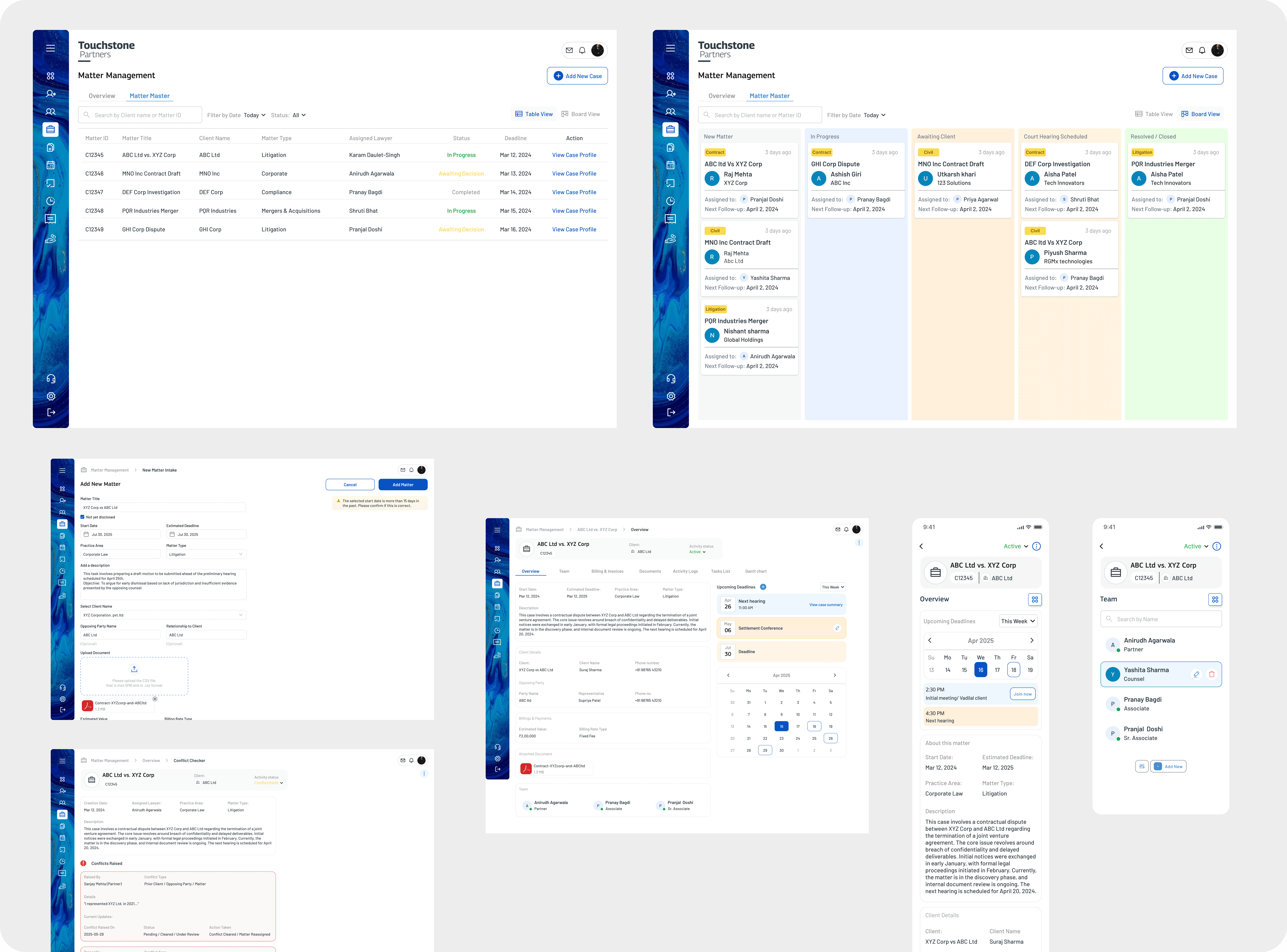 Finance dashboards, matter progress charts, and task lists had to be rich in data but designed so even non-technical staff could scan, filter, and act without training.